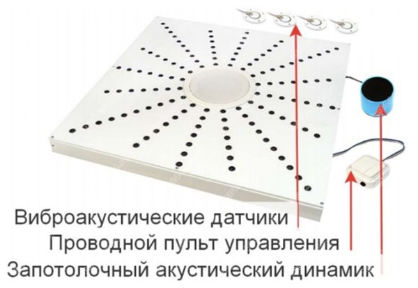 Защищает запотолочное пространство. Еще один динамик является внешним. Он размещается за потолочной плиткой и защищает пространство за потолком от возможных скрытых микрофонов и диктофонов.